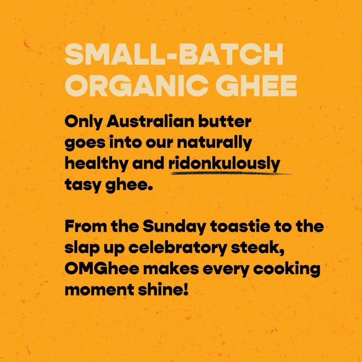 Give it some Ghee! Organic and small-batch, only Australian milk goes in our naturally healthy, immunity-building and ridonkulously tasty ghee. Fry with it, bake with it, spread it on tast, our ghee unleashes the glow in everyone and everything it touches.